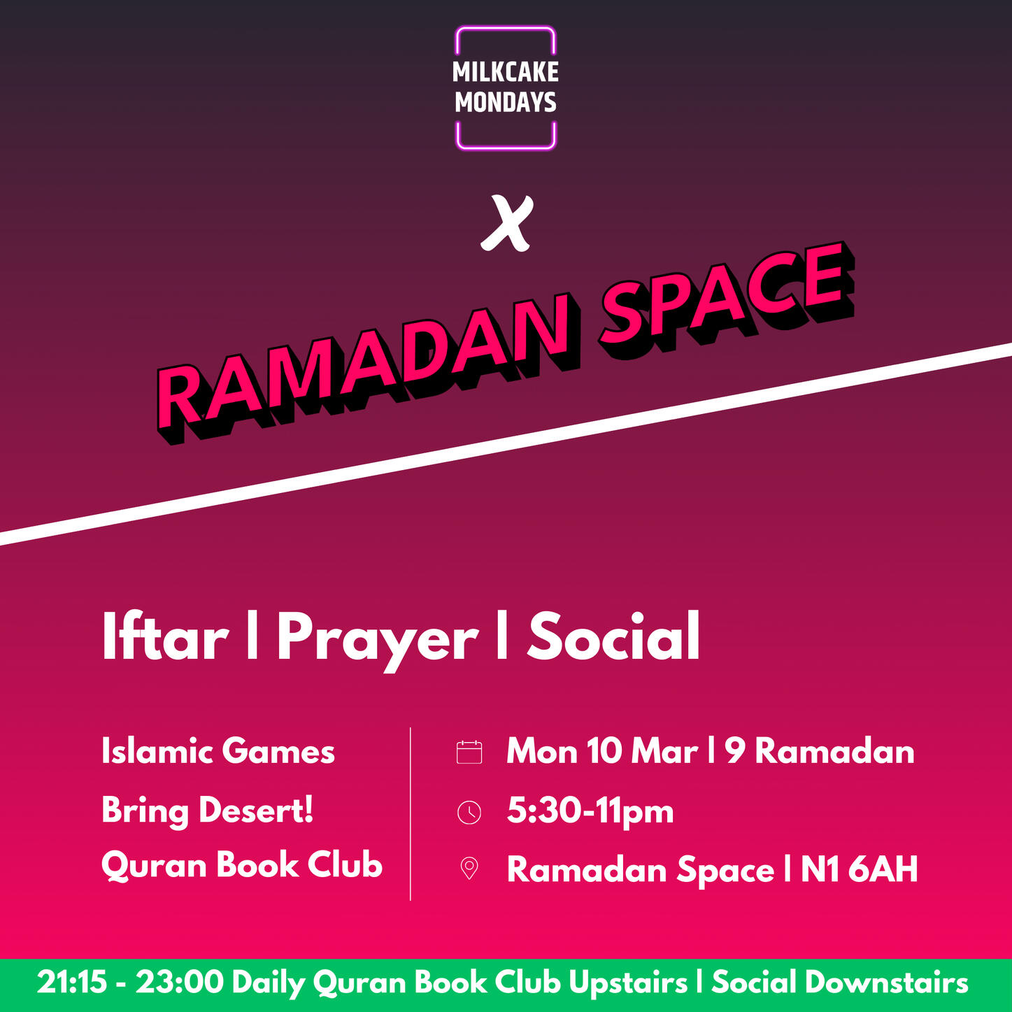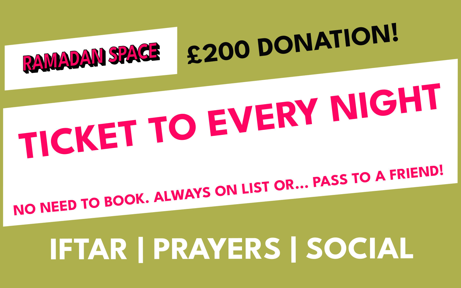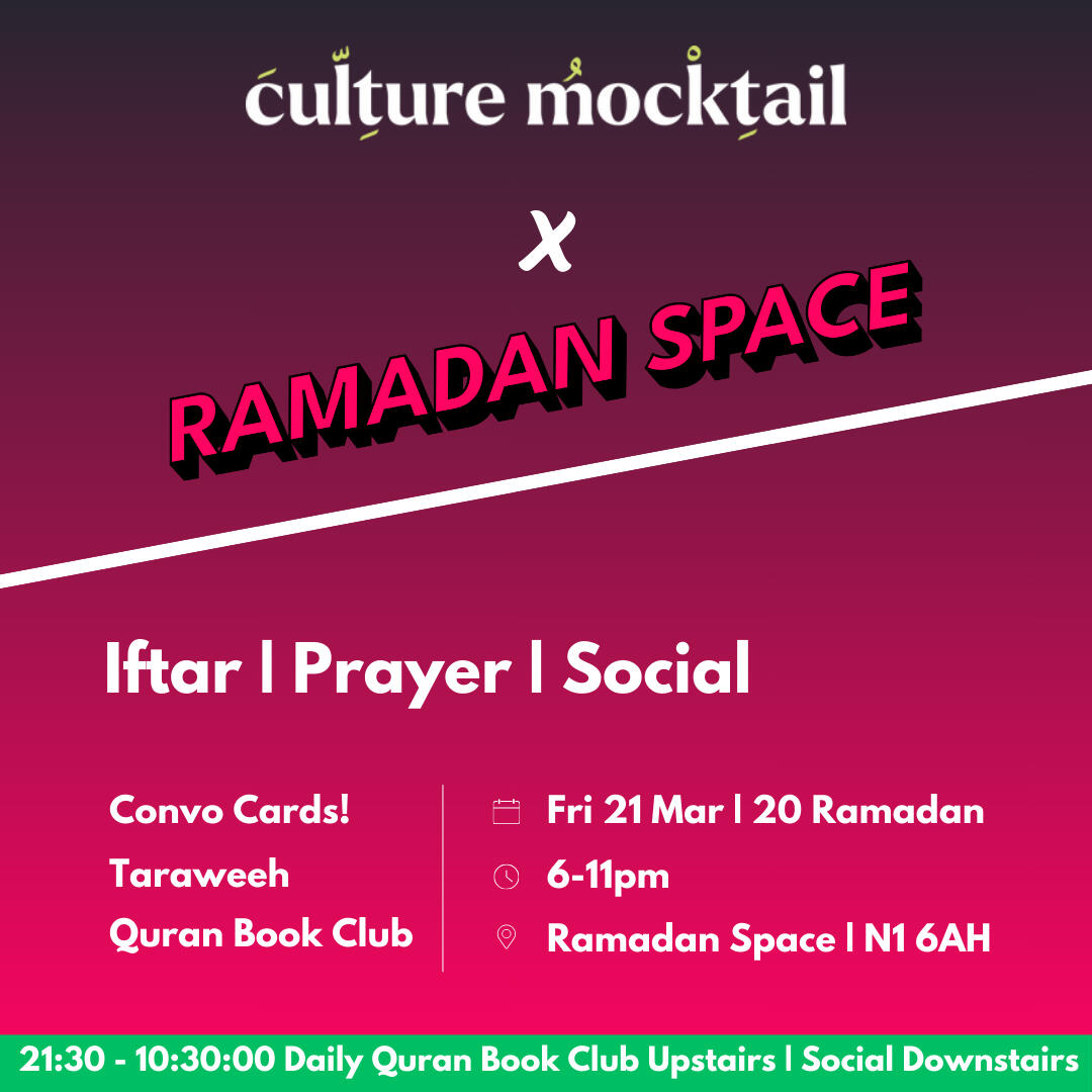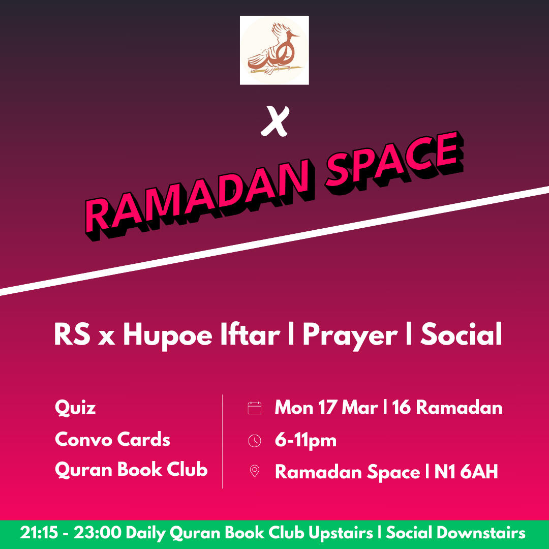 Where is Ramadan Space located?Ramadan Space is at 65-69 East Road, London N1 6AH.It is approximately a three minute walk from Old Street stationCan anyone attend?Yes. Everyone is welcome, including families with children, people of other faiths, and individuals who simply wish to experience the community atmosphereHow do I book a ticket for an Iftar evening?Visit the Ramadan Space website and choose the date you wish to attend.Each attendee must register to secure a place. Capacity is limited to 80 people per night, so early booking is recommended.What time are we supposed to get there and when does the session start?We open the doors about 15 minutes before iftar.We break fast with dates and water, pray, have dinner and then begin the programme at around 6:20pmWhat is the price of a ticket?The general ticket price is often around 5 pounds and some change, to cover processing fees.Special events or collaborations may cost slightly more. The specific price details for each event can be found on the website.How can I volunteer?There are several volunteer teams, including Kitchen Team, Set Up Team, Social Media Team, Programme Team, Ticketing and Registration Team, and more.If you wish to help, contact one of the admins via the WhatsApp chat or the website.What is a potluck event?A potluck is a gathering where each guest brings a dish to share.We coordinate the menu to ensure everyone can enjoy a variety of foods. If you have specific dietary requirements, please label your dish or mention it to the groupWhat happens to leftover food?In most cases, there is little surplus. Any remaining food is either shared with participants at the venue or distributed to those in need nearbyHow can I donate to support Ramadan Space?The entire project runs on donations to cover venue hire and meals.You can donate through the link provided on the Ramadan Space website.No amount is too small, and all contributions go directly towards running costs and Iftar expensesIs the space child friendly?Yes. Families with children are more than welcome. Children often add to the sense of community and joy at the Iftar gatherings.When does Ramadan Space open?The first Iftar will be on Sunday, 2 March, and events continue throughout the month.Keep checking the WhatsApp group or the Ramadan Space website for regular updates.Can we still attend without a ticket?Unfortunately no, it wouldn’t be fair to those who have already booked tickets.We may release more soon, so keep and eye on updates.Once the programme finishes, you’re welcome to join us for Tarawih prayers, socials & Quran Book Club.You can find Tarawih times further down in the FAQ.Is Ramadan Space open during the day? For co-working at all?No, it opens at 5:30. During the day other people are using it and that’s why we need to set up and remove all our stuff every day.I still have questions. How do I contact an admin?If your question is about volunteering or ticketing, feel free to mention one of the admins in the WhatsApp group.Is the venue accessible for those who cannot use stairs?The main event area is on the ground floor, but there is a short flight of stairs leading to another section.If you have any mobility concerns, please inform an admin in advance so we can offer assistance or make alternative arrangementsTarawihHow many rakats do we pray?We pray eight rakats every nightHow much of the Quran is being recited?We recite about half a juz each nightHow long does it take?About 1 hourWhat time is Isha and Tarawih?Sunday 2 March 8pm