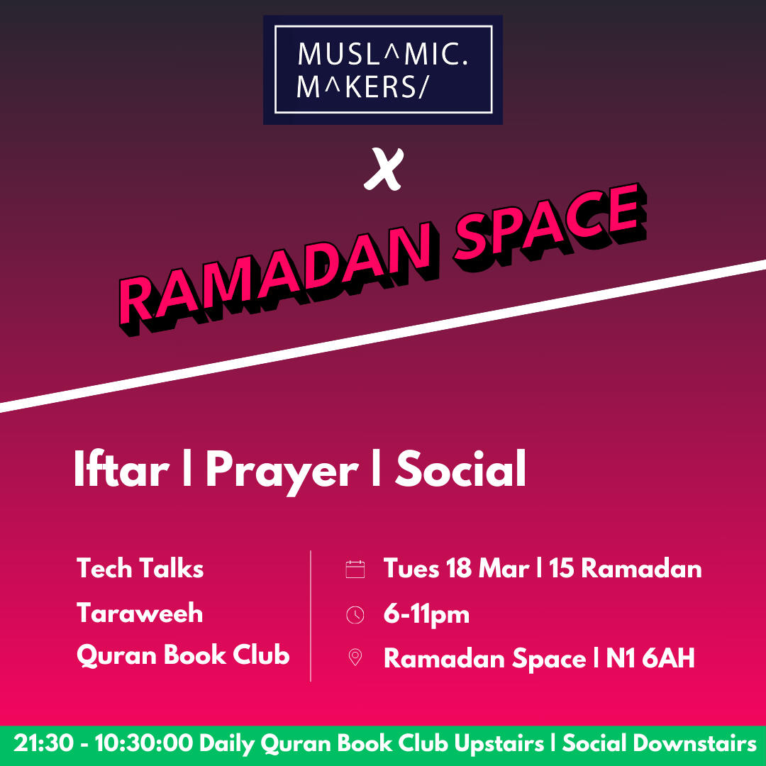 Ramadan Space Tech IftarFew tickets left...At Ramadan Space >> 3 mins from Old Street.Tues 11th March 17:30-22:40